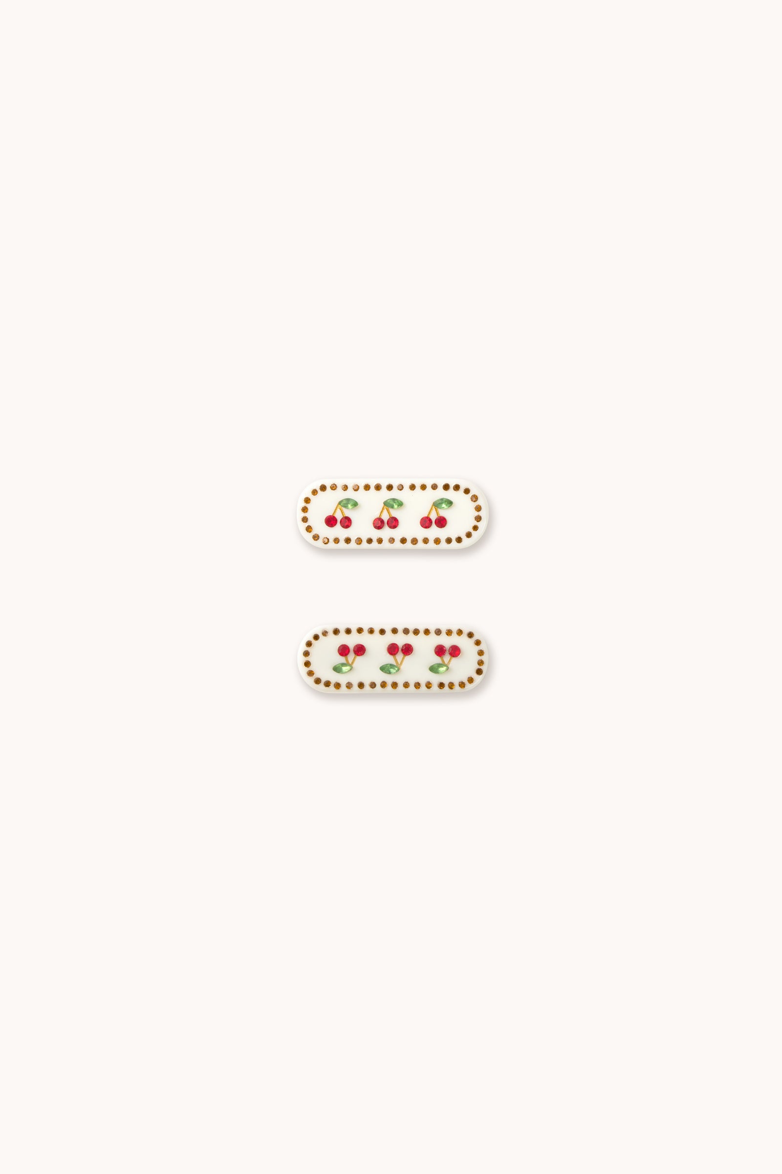 Pridėkite spalvų žybtelėjimą su šiuo stilingu plaukų segtuku, pasižyminčiu ryškiu vyšnių raštu ir blizgančiais dirbtiniais cirkoniais. Tai puikus aksesuaras, pagyvinsiantis bet kokią šukuoseną.