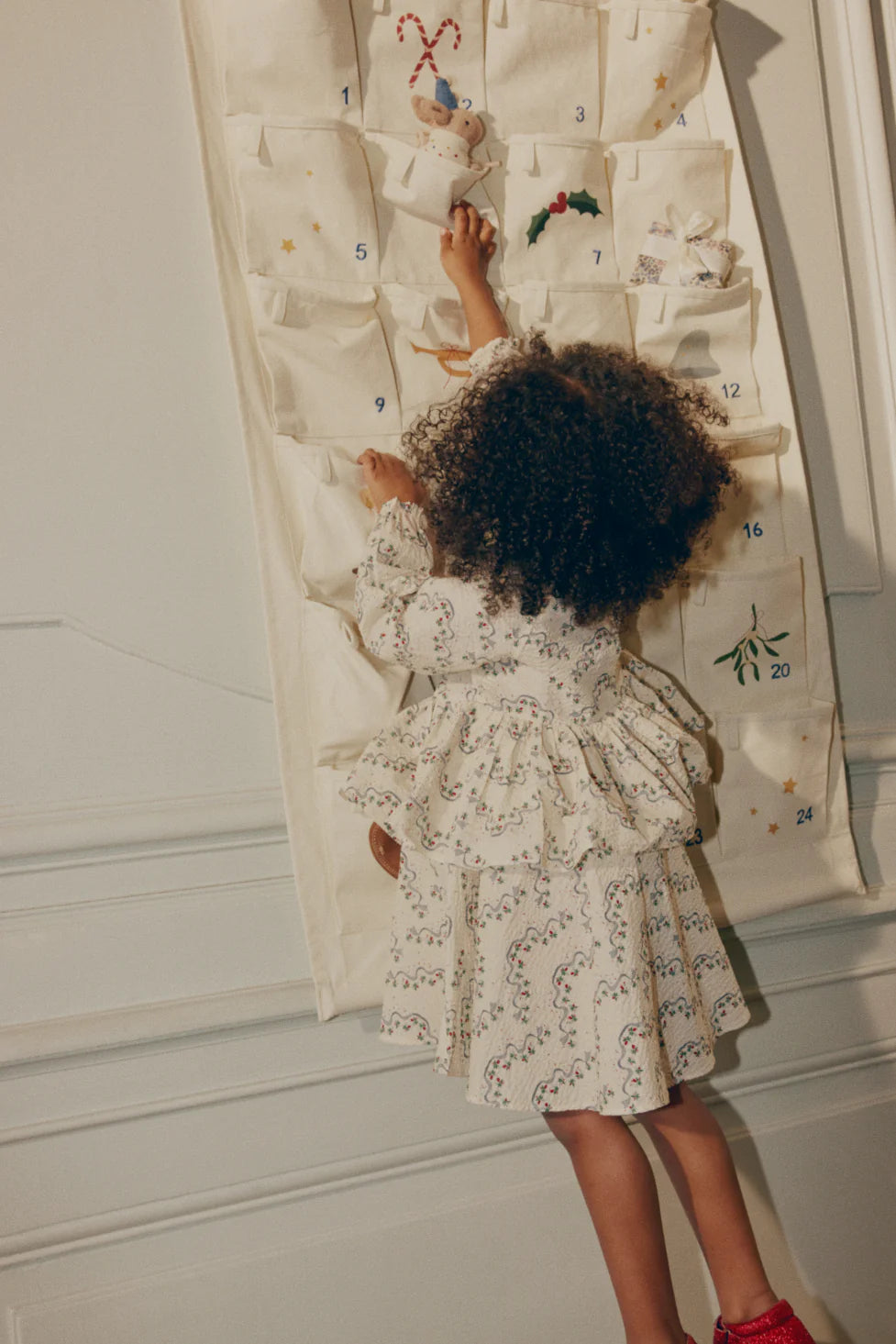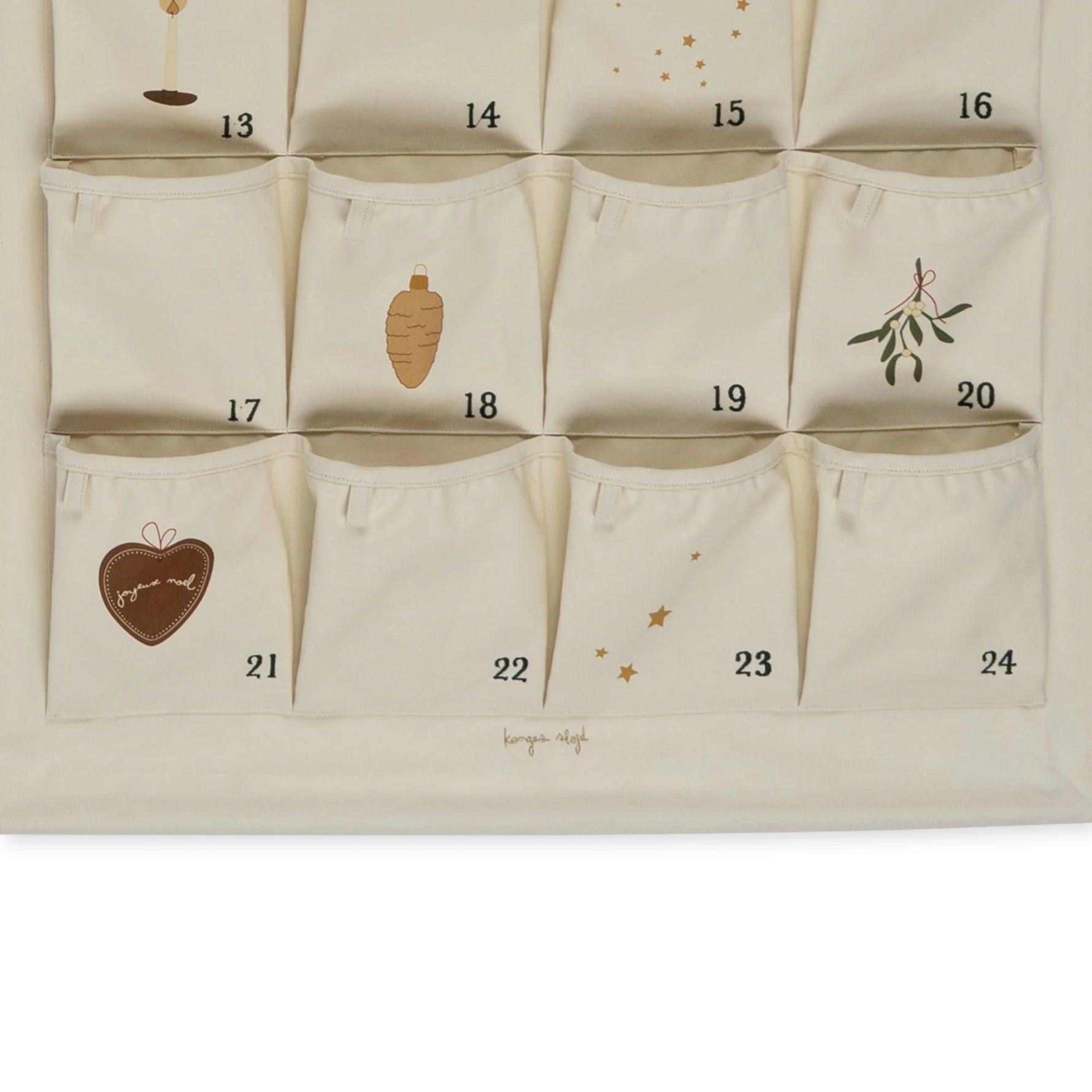 Medžiaginis. kalendorius su 24 kišenėmis. Jose galite paslėpti dovanėles ar saldumynus po vieną kiekvienai dienai iki Kalėdų.