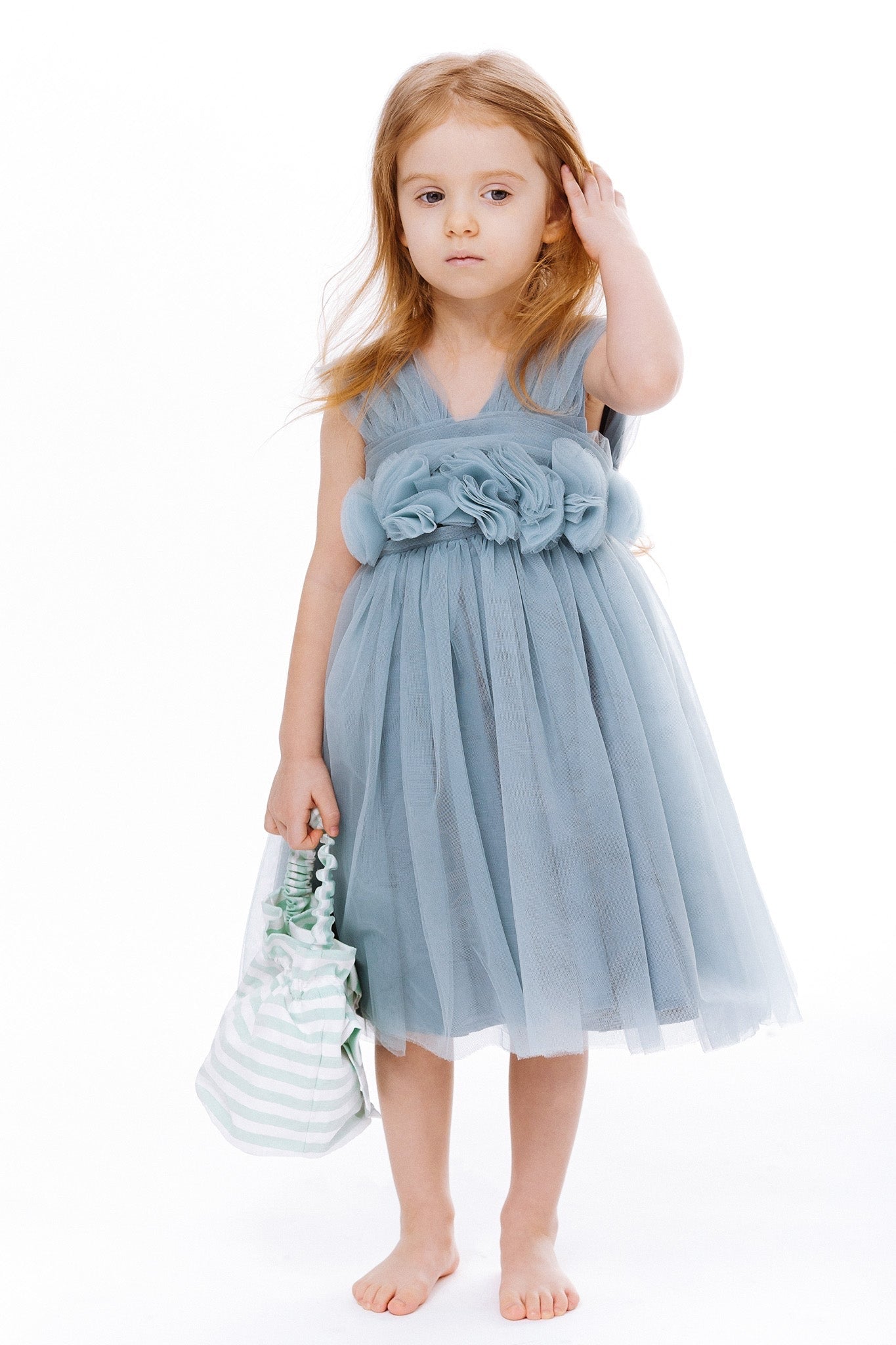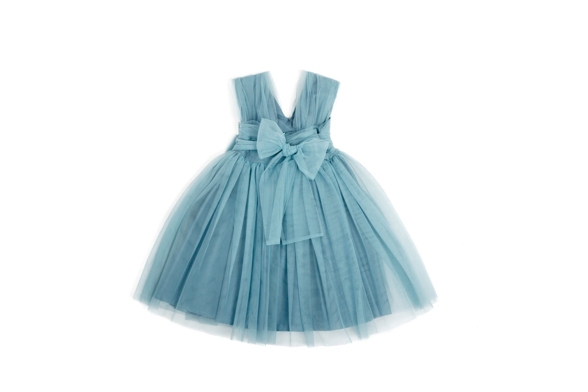 Švelniai melsvos spalvos suknelė.