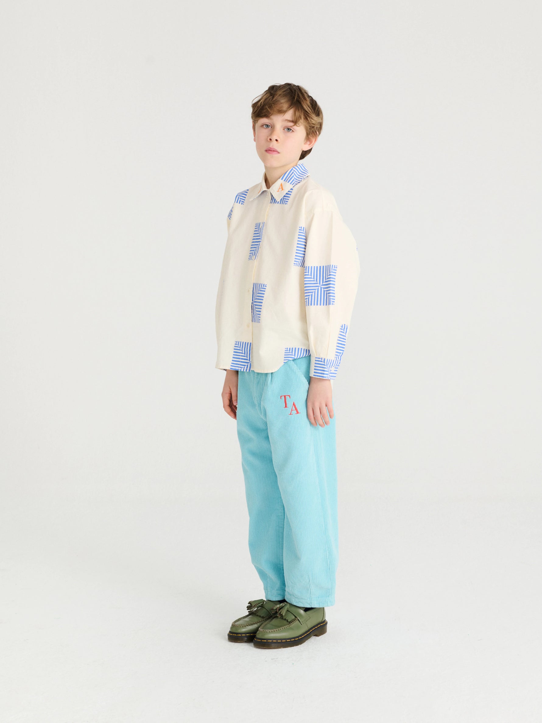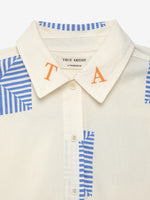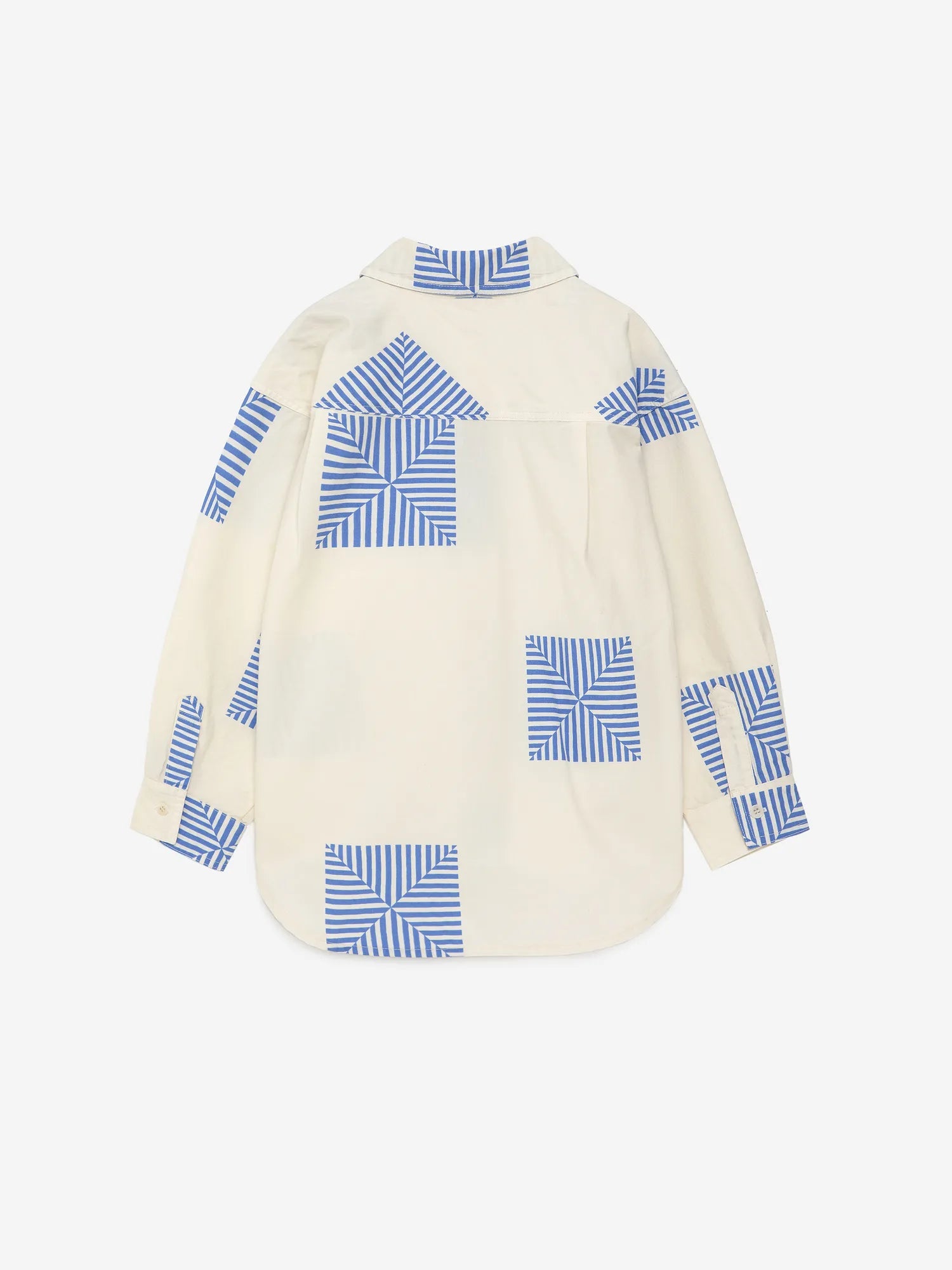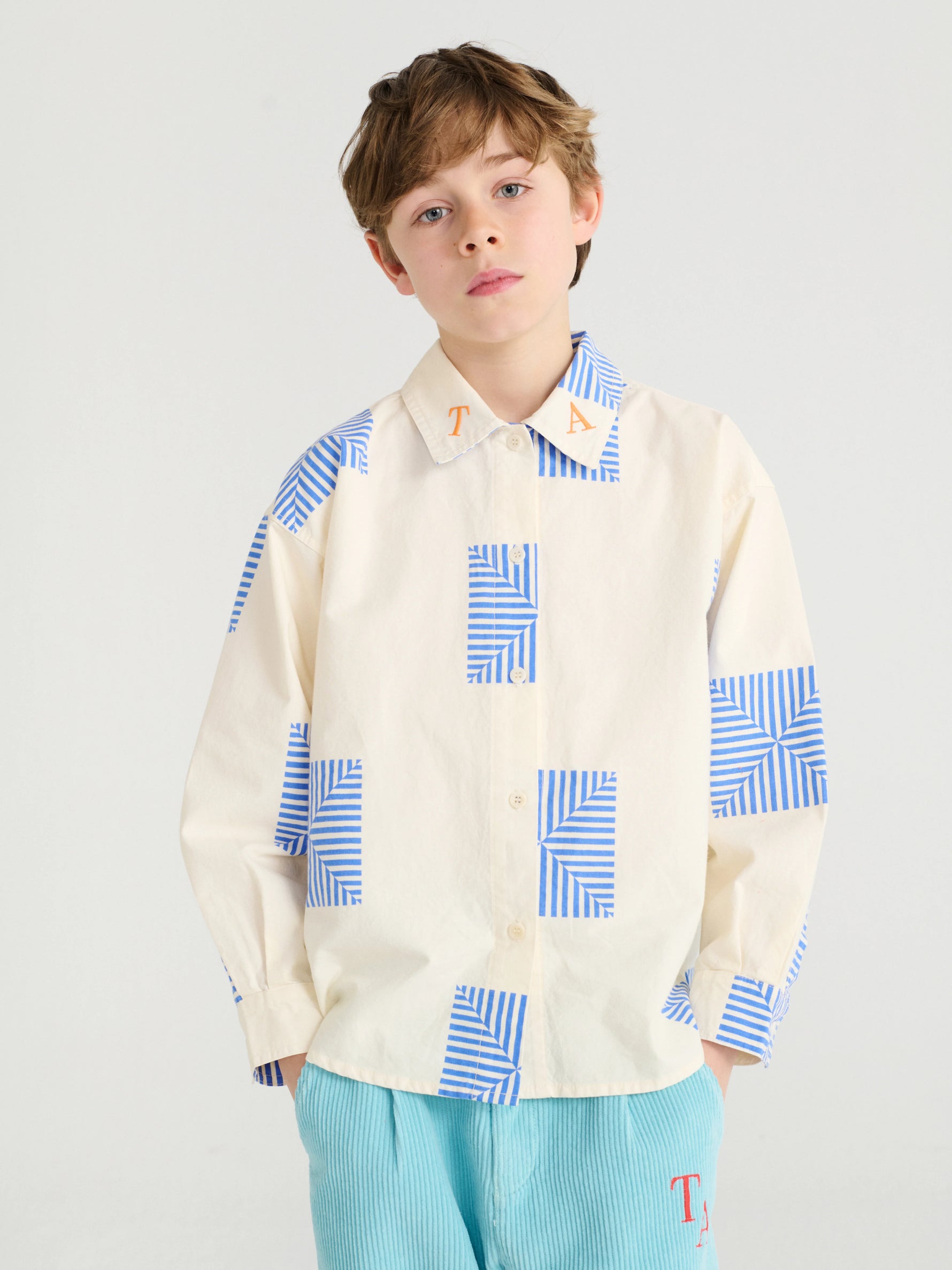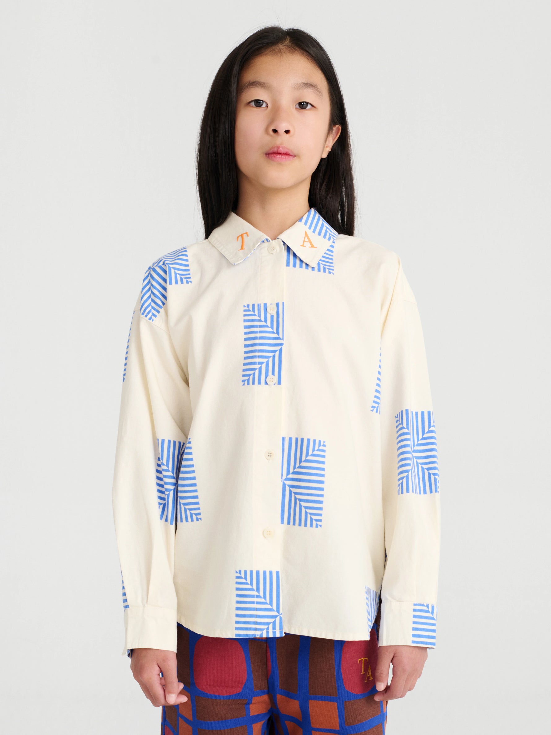 Kaleidoscope Shirt is made of 100% cotton and features our optical illusion print in blue. This spread collar shirt is designed with long sleeves, dropped shoulders, corozzo buttons and has a TA embroidered in contrast on the collar. It has a loose fit. Made in Spain