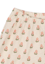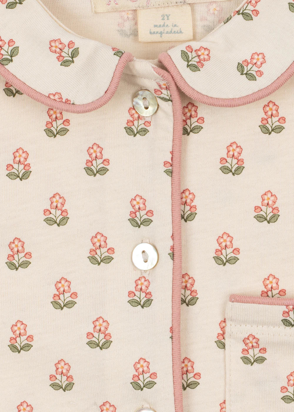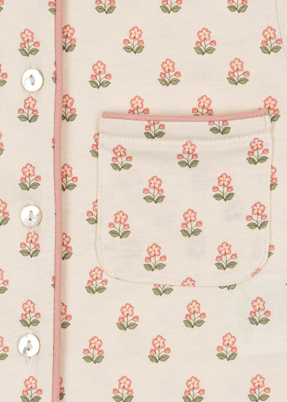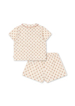 Minkštas dviejų dalių komplektas, kurį sudaro palaidinė trumpomis rankovėmis ir šortai su patogia elastine juosmens juosta. Palaidinė su sagomis per visą ilgį priekyje ir dekoratyvia apvalia apykakle.