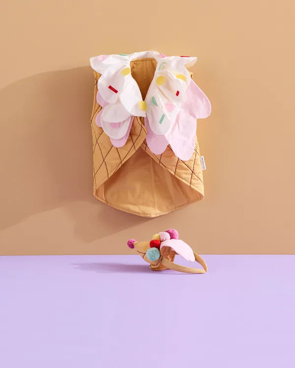 „Išsilieji? Geriau atrodyk kaip ledai.“ Šis persirengimo rinkinys kasdienius žaidimus paverčia kažkuo saldžiu. Liemenė yra ledų ragelio formos, lengvai paminkštinta ir languota, imituojanti vaflės tekstūrą. Aplink kaklą yra minkšta, laisvai krintanti apykaklė, šiek tiek panaši į tirpstančius kaušelius – tik be lipnios dalies. Viršuje yra kūgio formos kepurė su pritvirtintais mažais bumbulais, tarsi sukrauti ledų kaušeliai, kad būtų dar įspūdingiau. Kepurė pritvirtinta prie minkštos, audiniu aptrauktos galvos juostos, kuri patogiai laikosi vietoje – nereikia jokių raištelių ar tvirtinimo detalių. Pagaminti iš medvilnės ir sertifikuoti OEKO-TEX, apsiaustas ir kepurė yra lengvi, minkšti ir tinkami maždaug nuo 3 metų amžiaus. Lengva apsivilkti, dar lengviau paversti nauju personažu. Svarbiausios savybės: ledų įkvėptas dizainas: dygsniuota kūgio formos liemenė su minkšta, „tirpstančia“ apykakle žaismingam persirengimui. Kepurė su bumbulu: kūgio formos kepurė su minkštais bumbulais, pritvirtinta prie audiniu aptrauktos galvos juostos. Skatina vaidmenų žaidimus: puikiai tinka vaidmenų žaidimams, persirengimo dienoms ar kasdienėms kvailystėms.