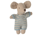 Mažas peliukas minkštu dryžuotu megztu kostiumėliu. Jis valandų valandas miega savo mažame dygsniuotame nešioklėje.