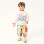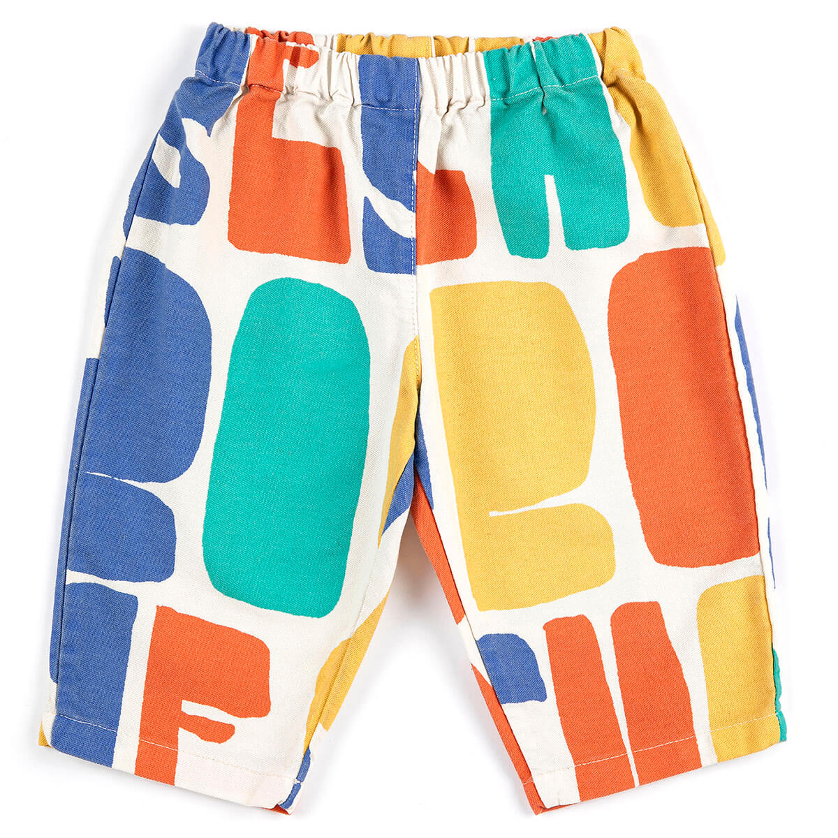 Spalvotos, ištisinės austinės kūdikių kelnės iš „Bobo Choses“. Įvairiaspalvės kelnės su tampriu juosmeniu, tiesaus kirpimo, iki kulkšnių su žaismingu „Bobo Choses“ raštu.