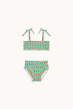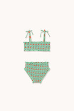 Pasiruošę vasarai! Šis maudymosi kostiumėlis su žavingu vyšnių raštu susideda iš rauktos viršutinės dalies su fiksuotais raišteliais ir derančios rauktos apatinės dalies su tampria juosmens juosta papildomam patogumui. Linksmas ir patogus įvaizdis, puikiai tinkantis saulėtoms dienoms.