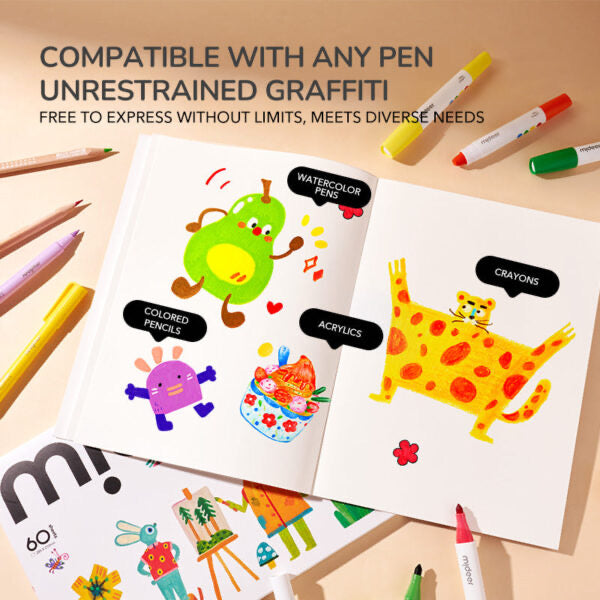 60 sheets of paper, each sheet can be easily peeled off to display or share your artwork. The sturdy cardboard cover provides a smooth and reliable surface for drawing, whether you're at home, in the park or on the go. Whether you're sketching, colouring or painting, the Mideer Sketchbook is the perfect companion for your art!