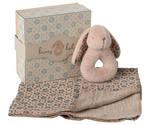 Puiki dovanų idėja mažyliams! Šiame rinkinyje rasite švelnų medvilninį merliuką ir mažą triušiuko formos barškutį. Triušiukas turi viduje paslėptą barškutį, kuris skleidžia švelnų garsą, ramiai lydintį kūdikį. Visa tai supakuota į gražią dovanų dėžutę – paruošta dovanoti.