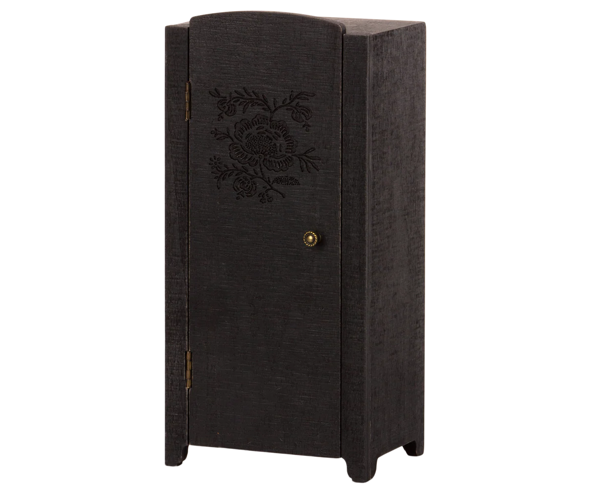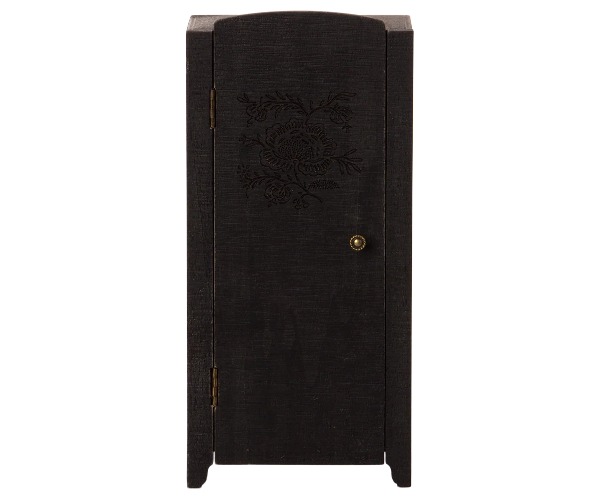 Šios vintažinės išvaizdos spintos priekyje yra gražus reljefinis gėlių raštas, o viduje – gražiai atspausdinti tapetai. Viduje esančios lentynos užtikrins, kad prasidės organizuojamas žaidimas. Ši spinta telpa į Maileg lėlių namelį.