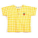 Pixel Strawberry Vichy Woven Baby Blouse by Bobo Choses. Yellow shir designed with short sleeves, dropped shoulder, front button fastening, embroidery, a round neck and a relaxed fit.