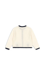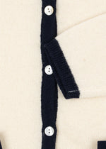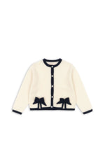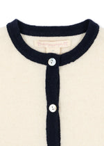 Soft 100% wool cardigan with bow detailing. Classic design with round neck, contrast edges, and mother of pearl buttons.