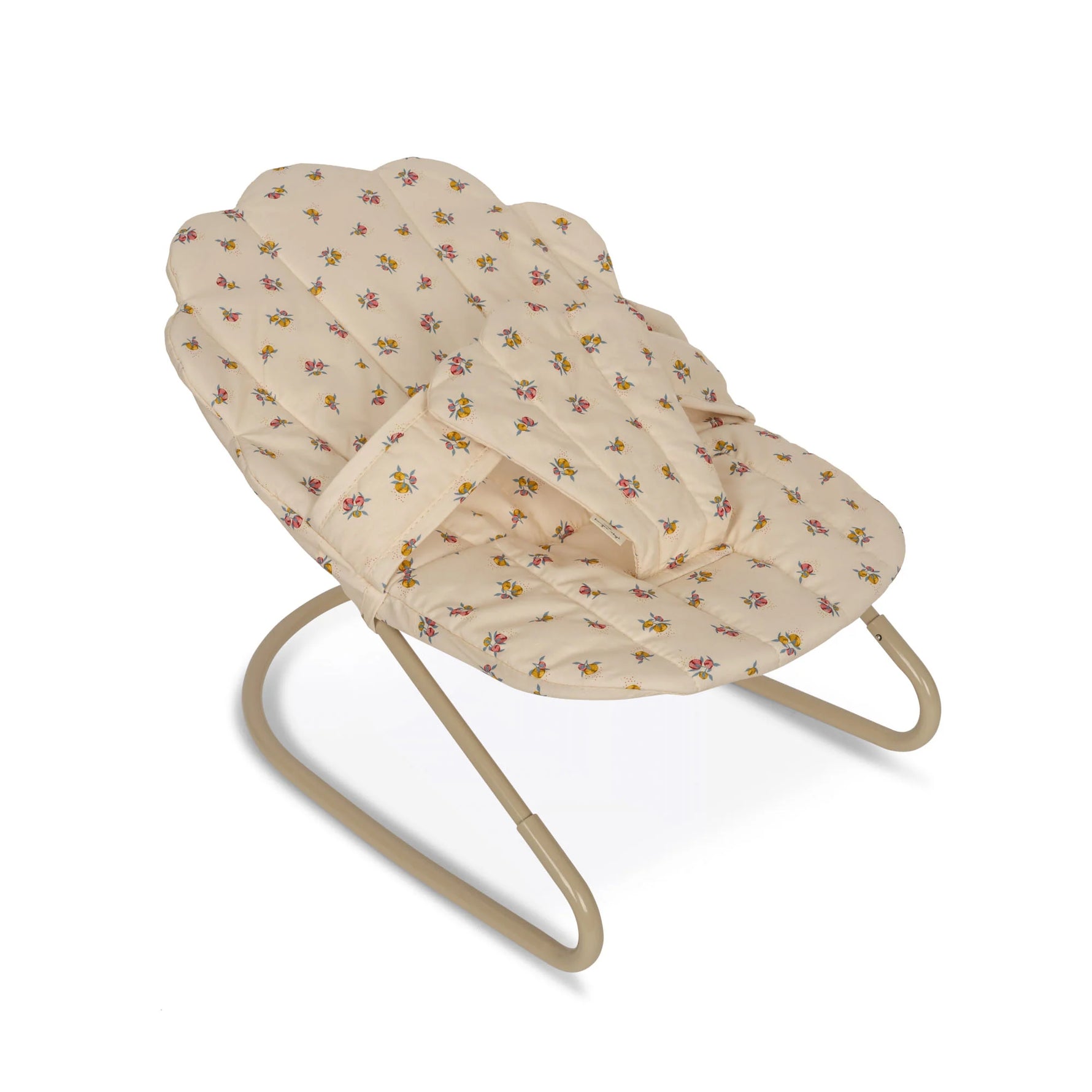 Bouncer made for dolls with easy velcro strap closure suitable for a 40 cm long doll. The fabric cushion seat is made from recycled cotton and has recycled polyester padding inside. The seat is easy to remove and machine washable. The frame is made from metal.