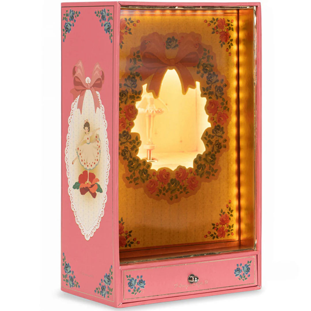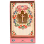 Sweet treasure chest with a vintage style pull-up ballerina inside. Pull the tab on the back of the box to activate music, light, and movement. Ideal for the kids' room as a beautiful decoration.