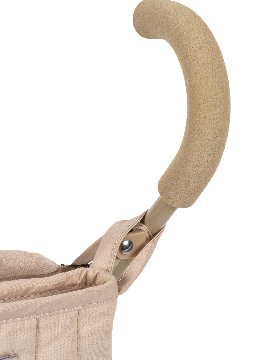 Doll stroller designed with a harness, carriage bag, and double wheels on all four legs for extra stability. Features removable fabric that can be washed after use. The frame is made of iron with soft and spongy handles that makes it comfortable to walk around with.
