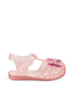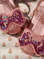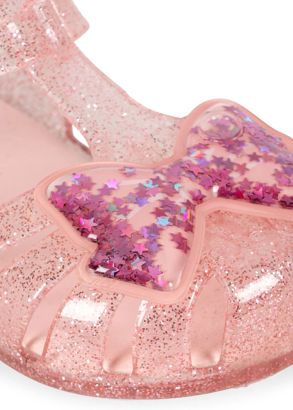 Glittery beach sandals made in PVC with a practical velcro closure that is easy for little hands to adjust. Designed with a signature Konges Sløjd cherry on top - squish gently to watch the glitter dance.
