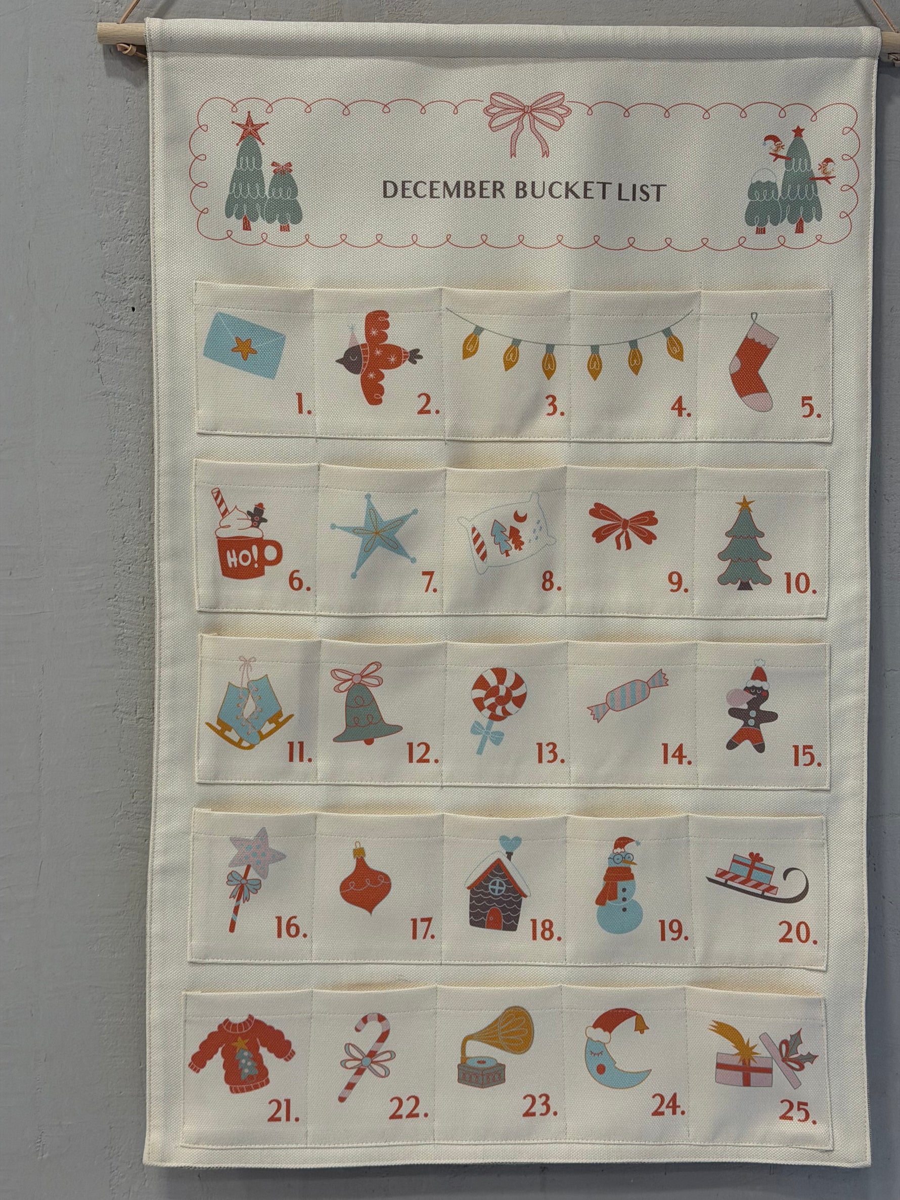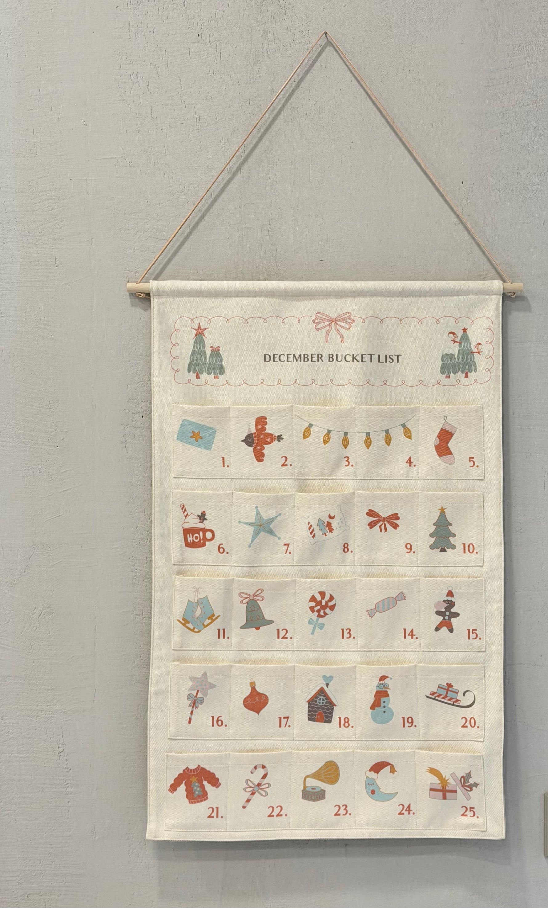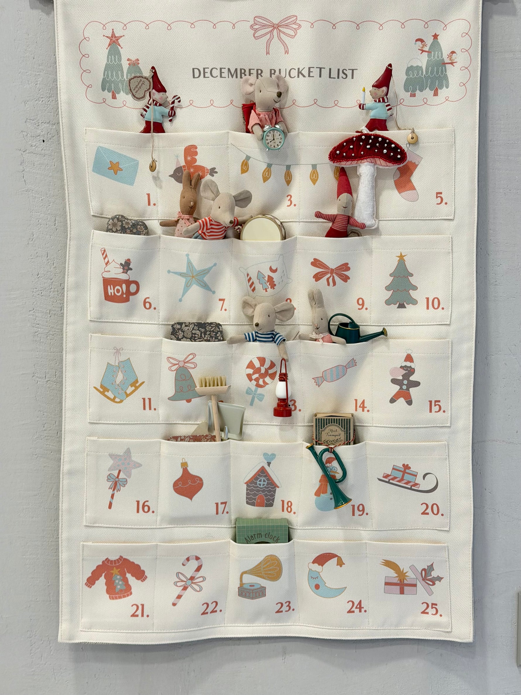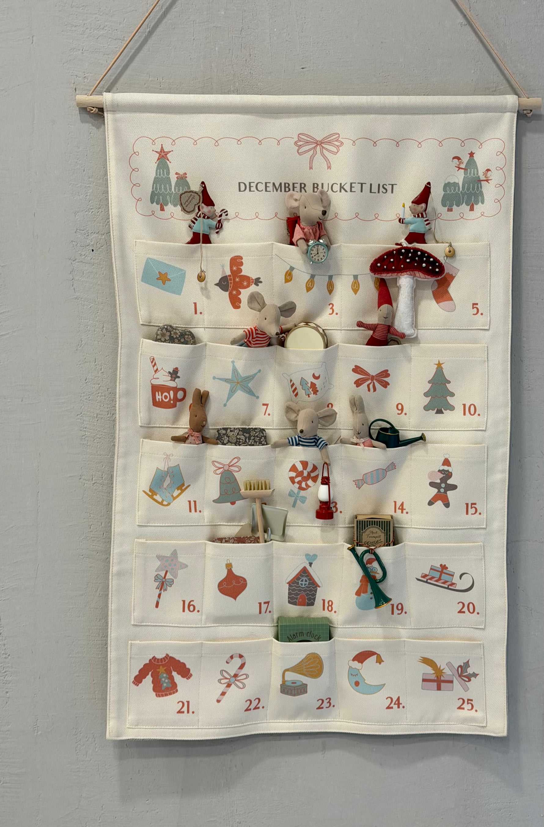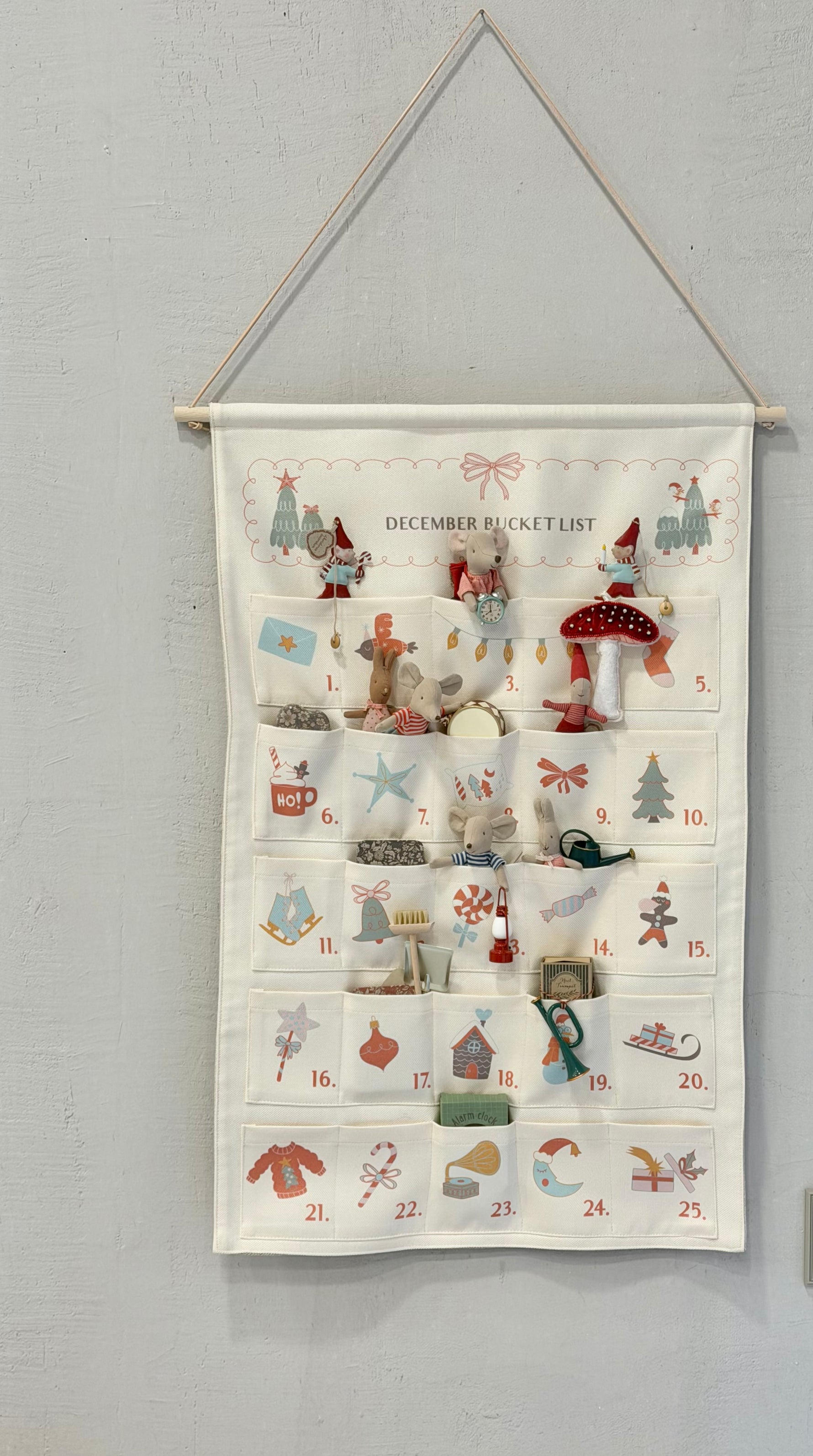 Medžiaginis kalendorius su 24 kišenėmis sudėti dovanėles po vieną kiekvienai dienai nuo Advento iki Kalėdų. Parduodamas be dekoracijų. Maileg žaisliukus galite užsakyti atskirai🎪Lengvai pakabinsite už virvelės.