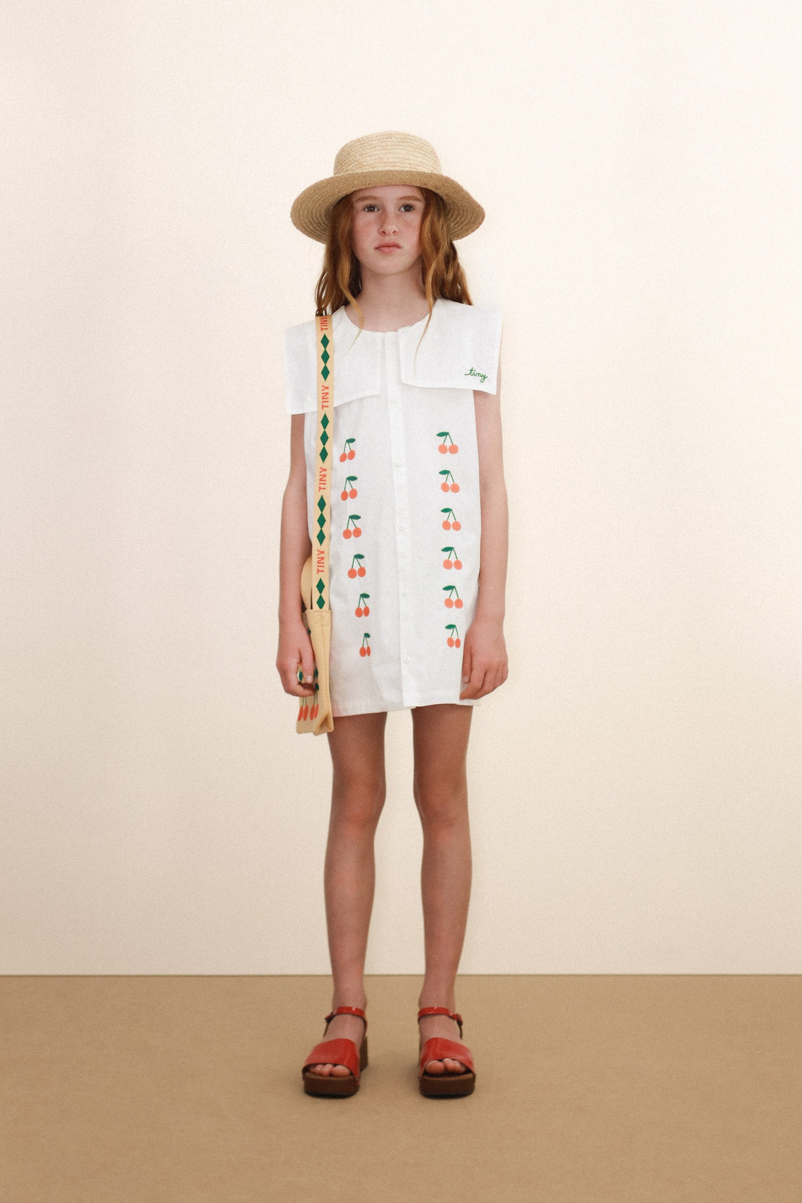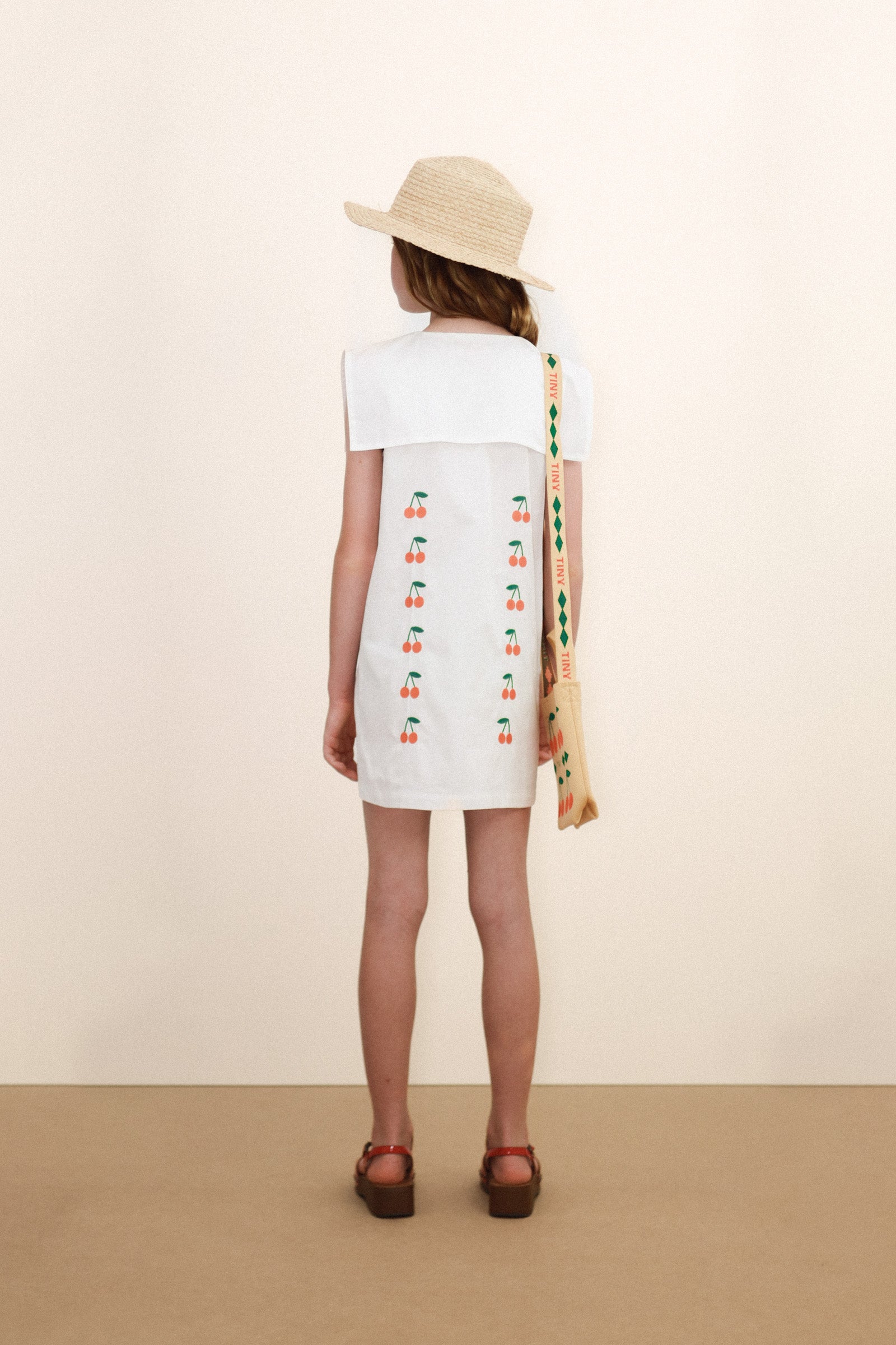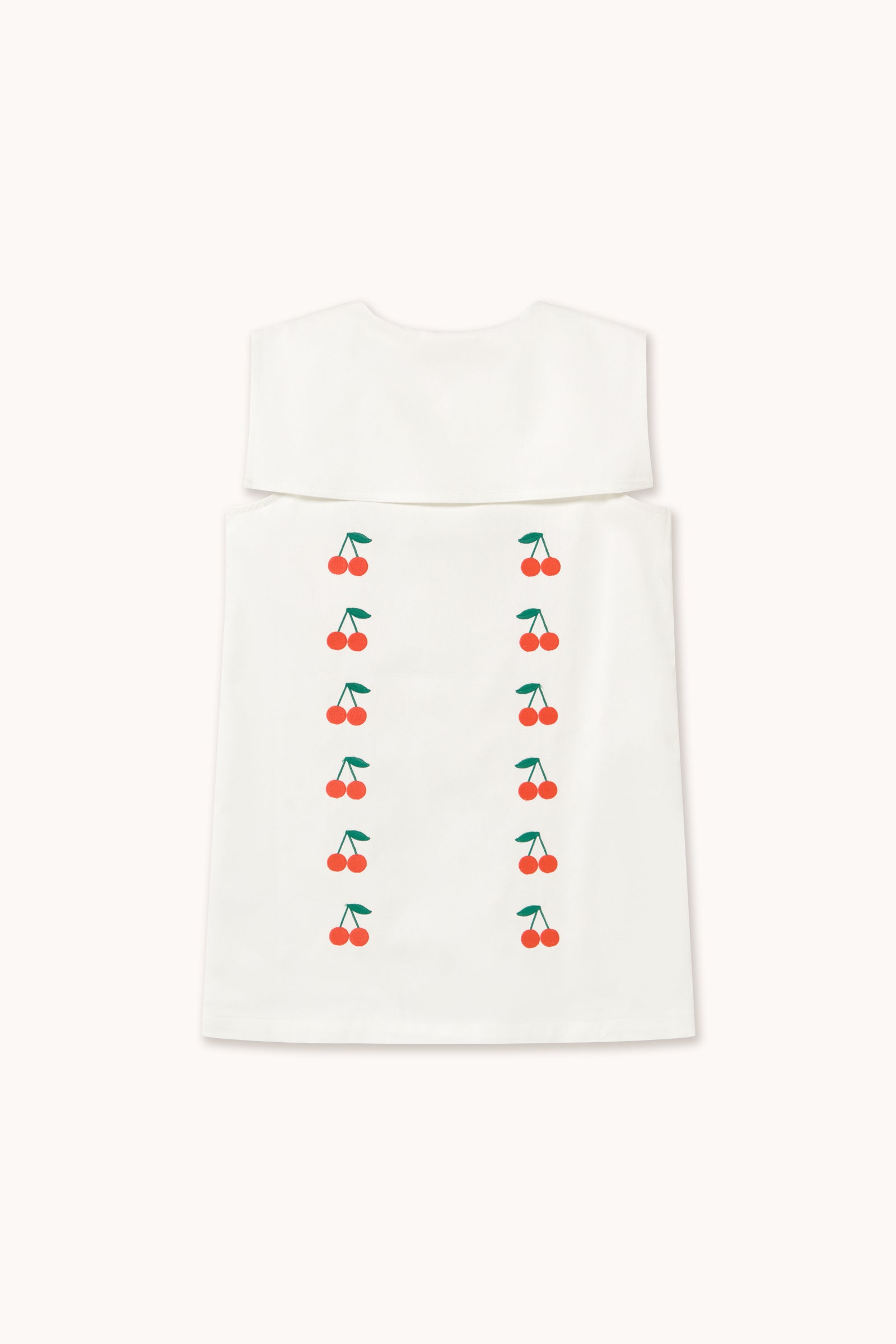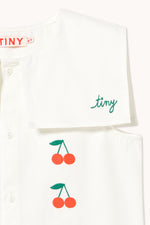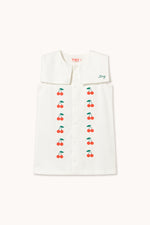 This short dress in soft mid twill, featuring an off-white base and Mini Cherries embroidery, combines a classic design with a delicate touch. It features a front button-down opening all the way to the hem and a square sailor collar that adds an elegant, charming look, perfect for any occasion.