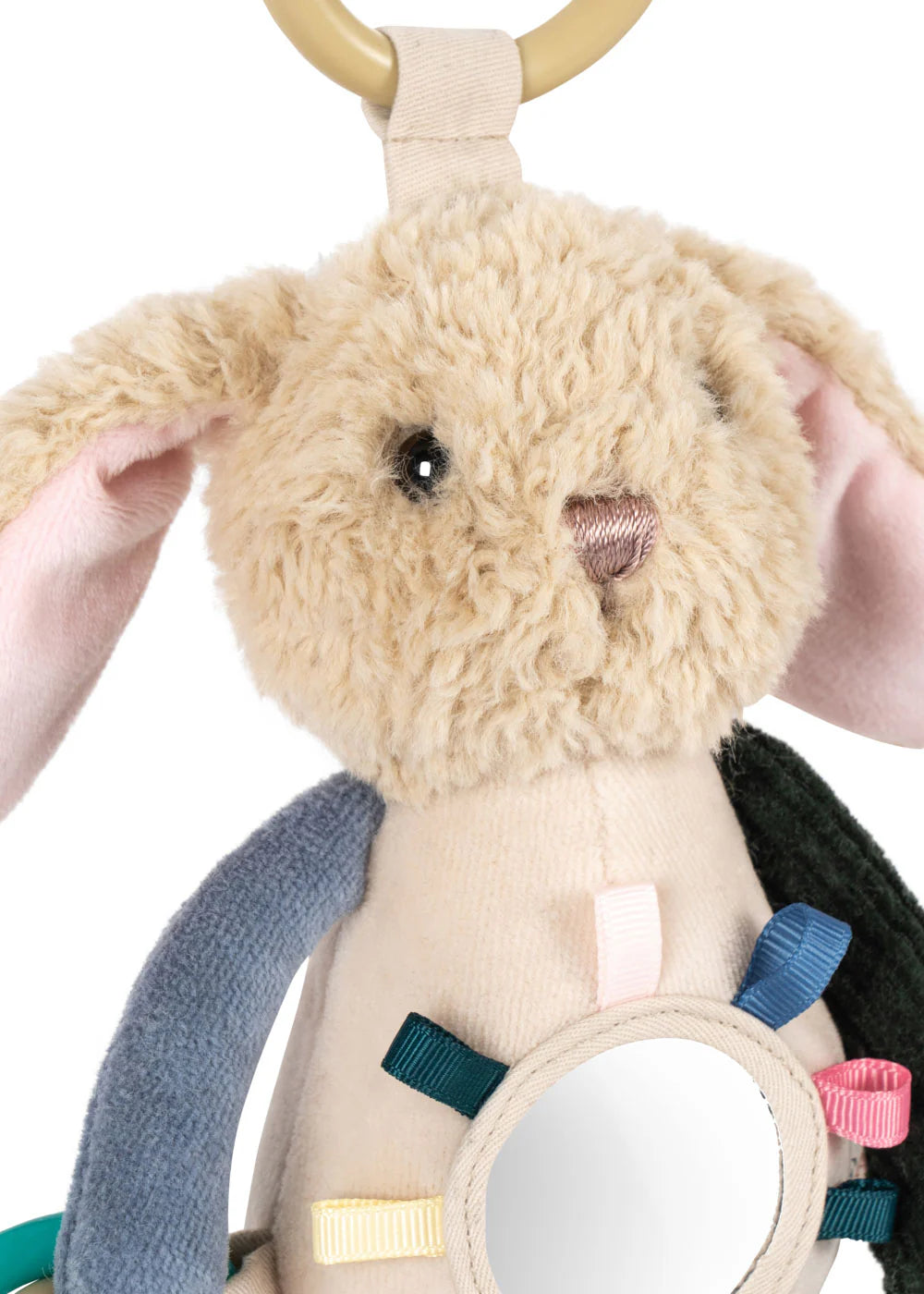 Peluche is designed with different textures that stimulate the senses, a rattle function, a mirror, and easy-grab handles.
