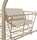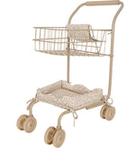 Shopping cart for tiny shoppers designed with pivoting front wheels that make it easy to steer.