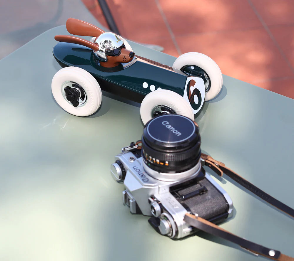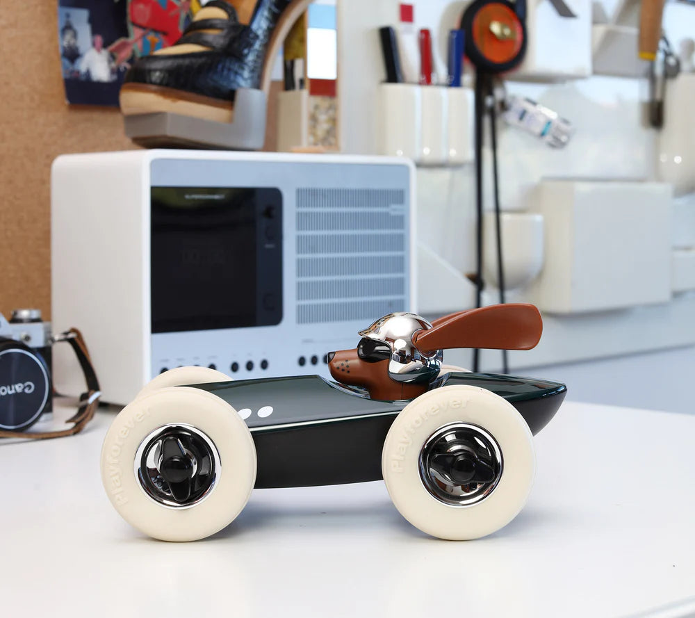 The Rufus collection is designed and made by Playforever, following their recent collaboration with Hugo Boss. A streamlined shape with a geometric front and pointed 'ridge' on the bonnet top, smoothing out to a rounded form at the back, this car means business - and SPEED! I mean, those dogs' ears say it all.