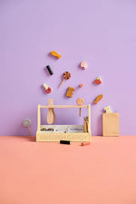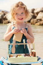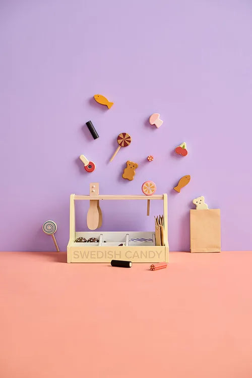 Mes mėgstame saldainius! Švediškų saldainių žaidimų parduotuvė dabar atvira visiems smaližiams. Mūsų saldainių parduotuvėje gausu gardžių skanėstų, tokių kaip guminukai, grybai, kolos buteliukai, punšo pralinė, kramtomos vyšnios ir ledinukai ant pagaliuko – visi pagaminti iš medžio! Nepamirškite ir pamėgtų „saltlakrits“ (sūrių saldymedžio lazdelių), kurios puikiai dera su aviečių lazdele ir sukuria puikų derinį. Švedijoje saldumynais dažnai mėgaujamasi per tradicines „lördagsgodis“ arba „šeštadienio saldainius“, kai šeimos mėgaujasi skanėstais savaitės pabaigoje. Švediški saldainiai, kuriuose gausu ryškių ir švelnių skonių, siūlo kažką, kas patiks kiekvienam. Rinkinį sudaro saldainių stovas, saldainių replės, trys popieriniai maišeliai, trys ledinukai ant pagaliuko ir įvairios medinės saldainių figūrėlės. Pridedamos replės padeda vaikams praktikuoti rankų judesius, kai jie apsimeta parduodantys ir perkantys saldainius, todėl žaidimas tampa įtraukiantis ir smagus. Kaip saldainių parduotuvėje... Ši saldainių parduotuvė skatina vaizduotę, leisdama vaikams kurti savo saldainių istorijas ir dalintis jomis su šeima ir draugais.